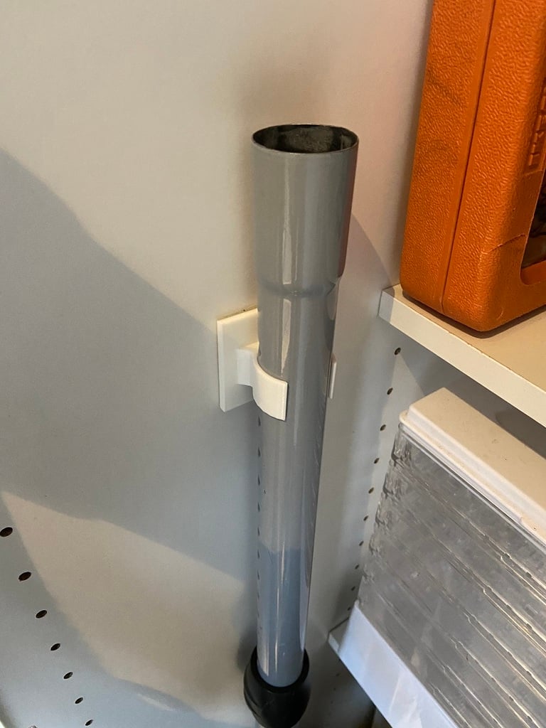 Support pour tuyaux de 32 mm, balais, etc. Conçu pour les accessoires d'aspirateur afin d'organiser l'armoire de nettoyage. Conçu avec une empreinte de 50x50 mm pour la fixation du ruban adhésif double face (non inclus).