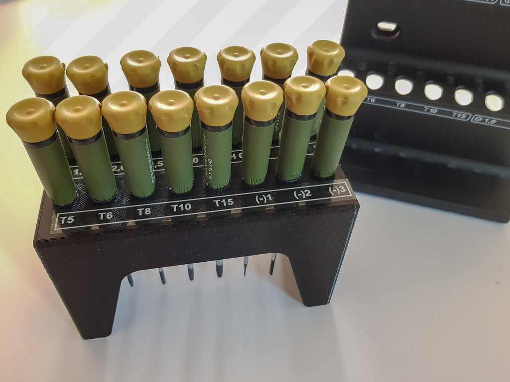 Il s'agit d'un porte-tournevis pour les jeux de tournevis Proxxon. Il est conçu pour bien se poser sur la table, bien que l'ensemble soit initialement destiné à un montage mural. Le support empêche les tournevis de tomber au sol et facilite l'organisation de vos outils.
