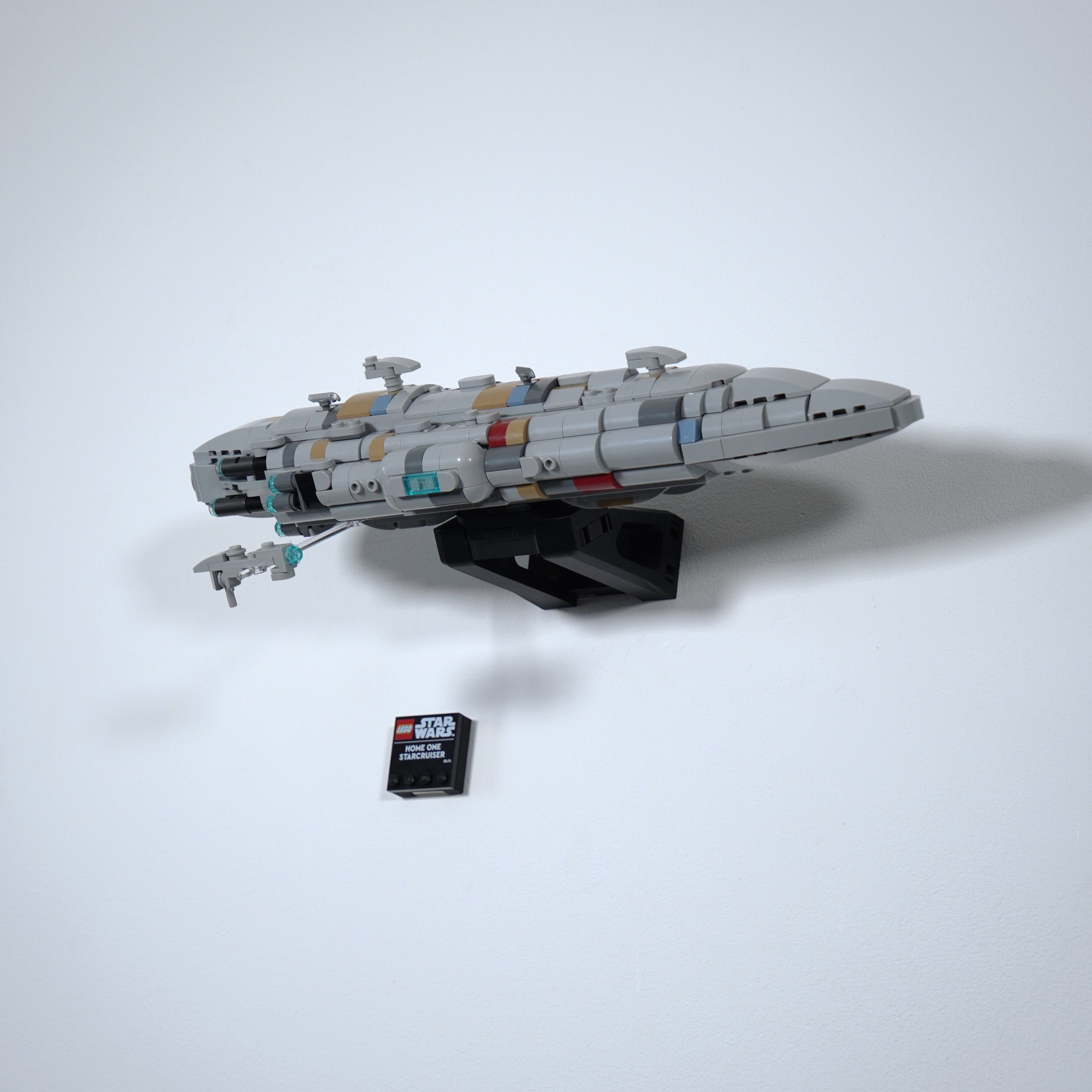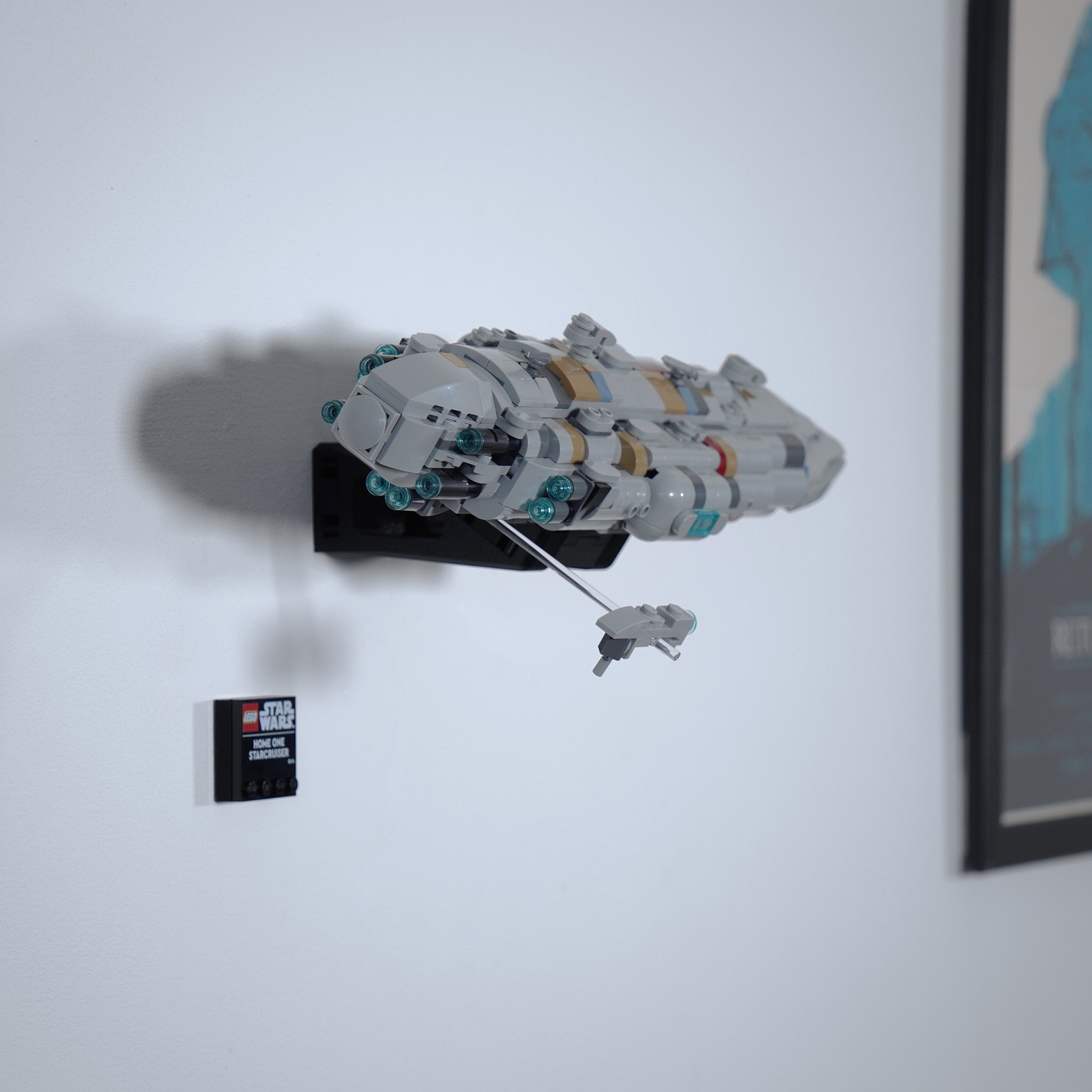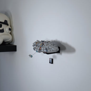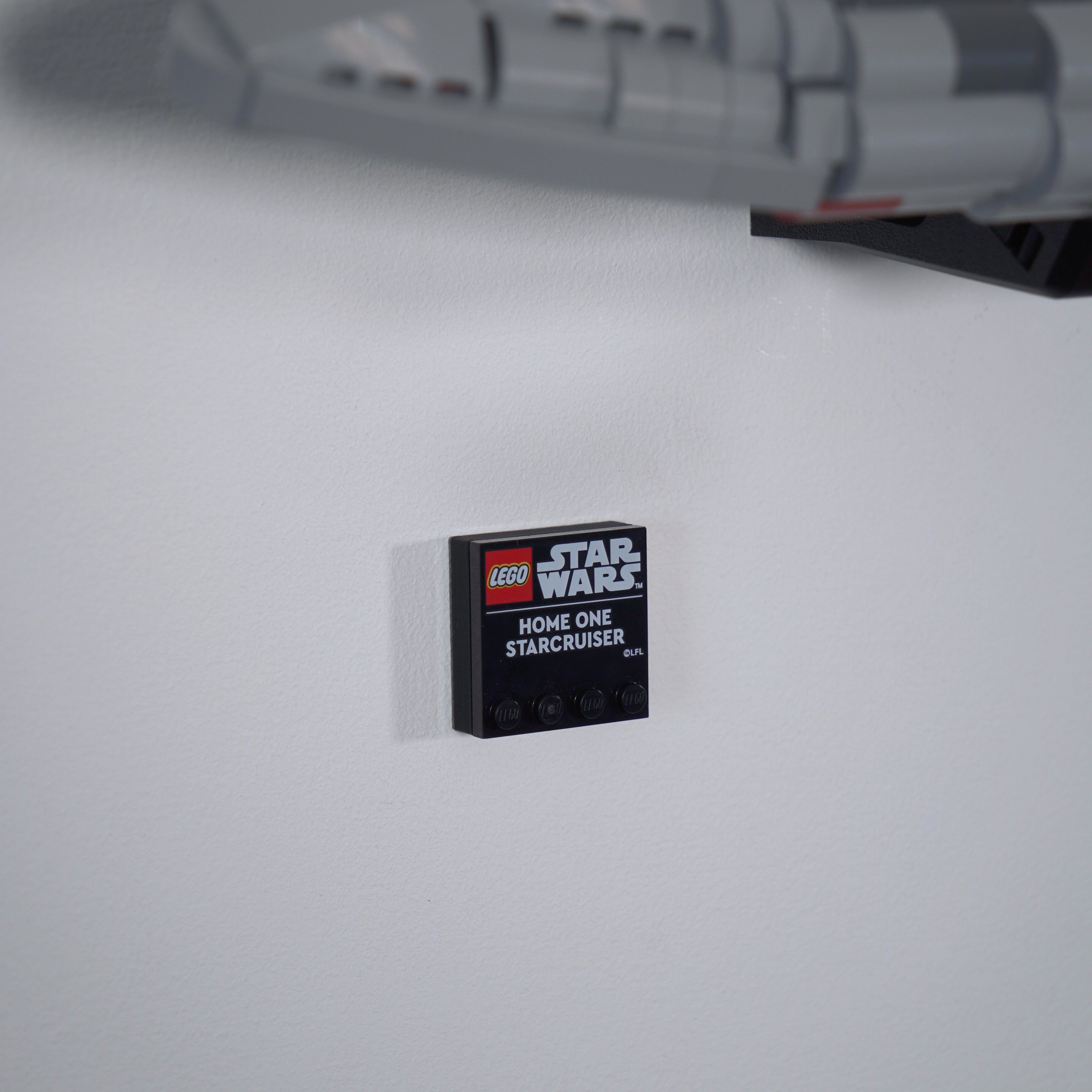 Ce support mural vous permet d'exposer votre LEGO Home One Starcruiser soit à plat contre le mur, soit incliné sur l'un des côtés. Le modèle peut être facilement retiré si nécessaire, et la solution comprend un support séparé pour la plaque signalétique pour une exposition complète à la maison.