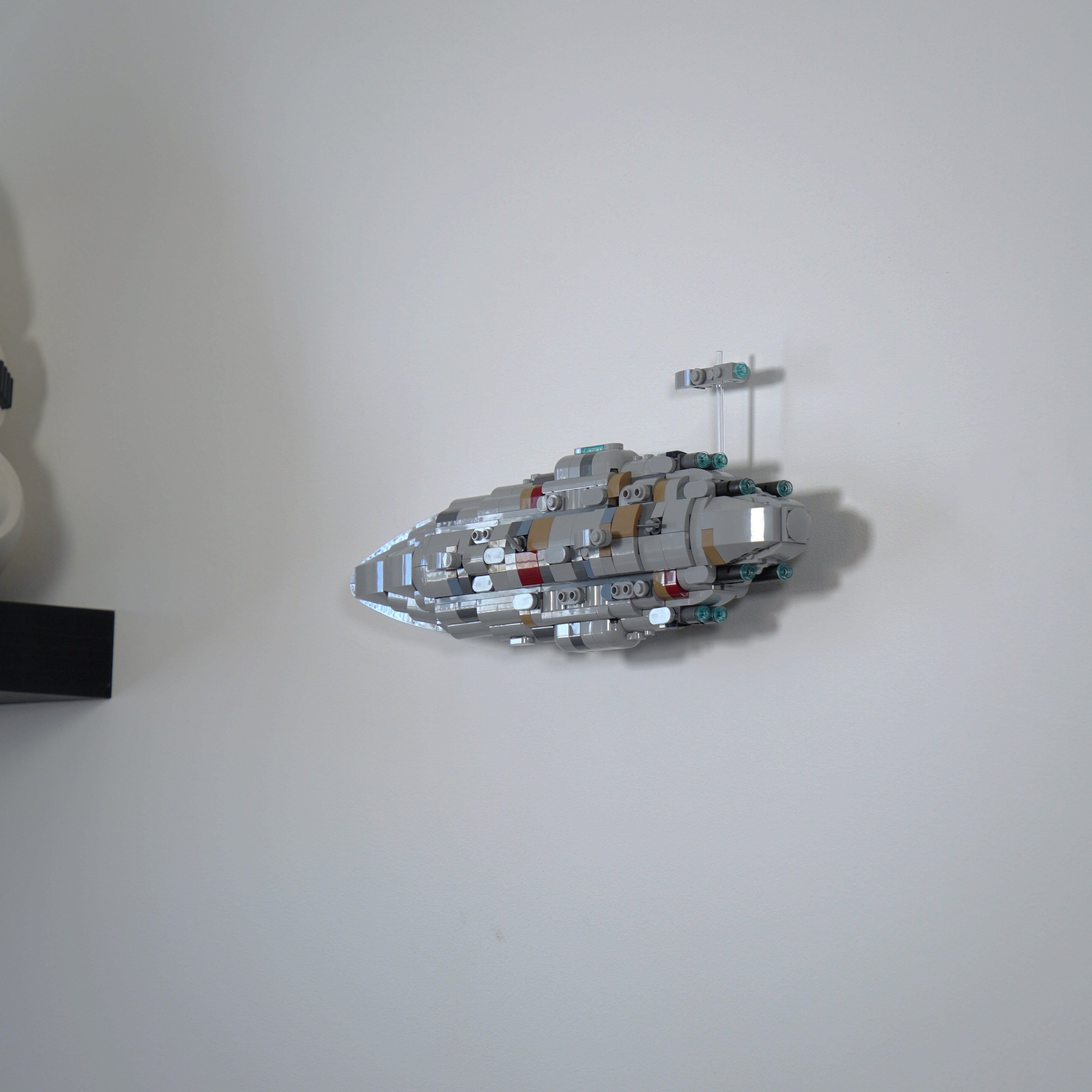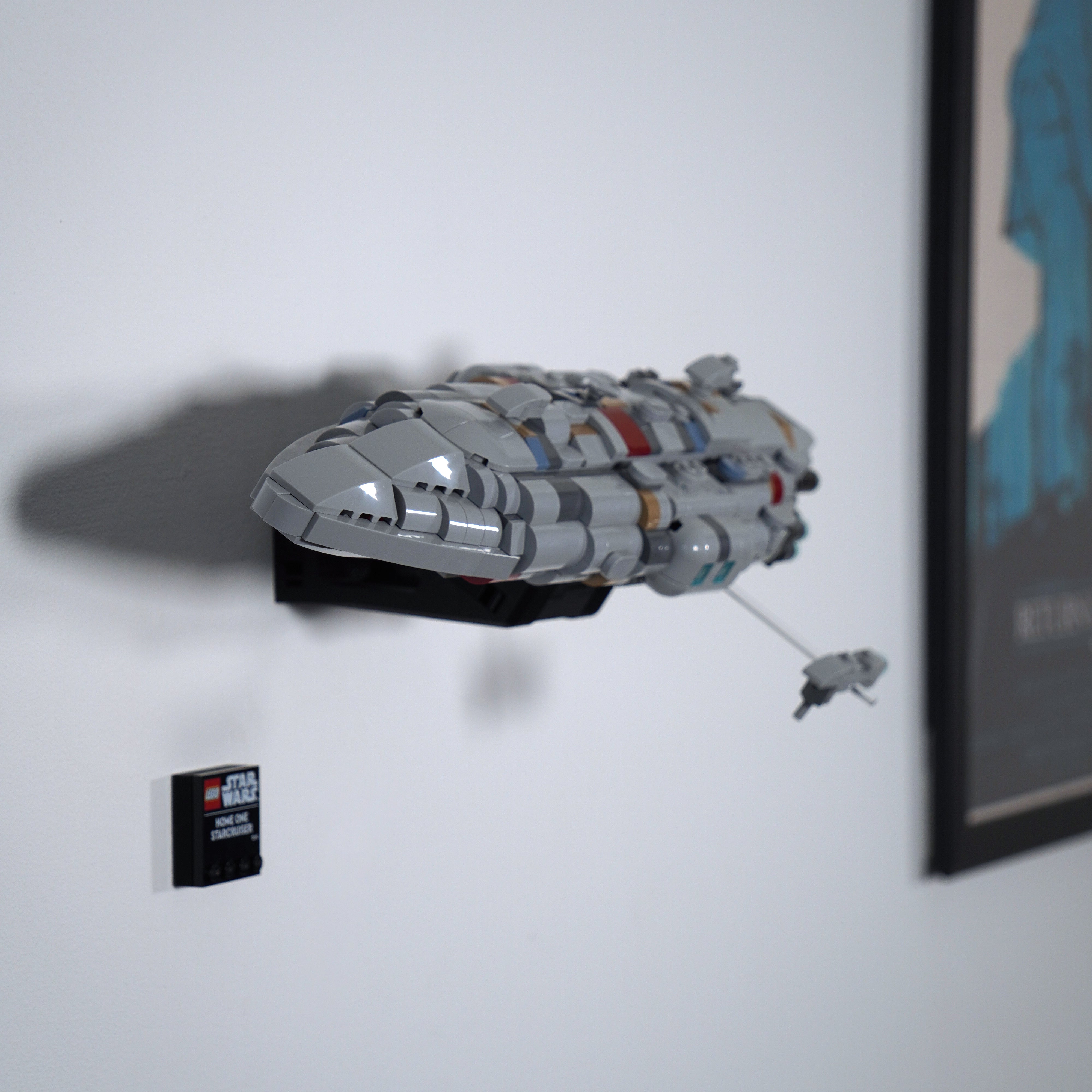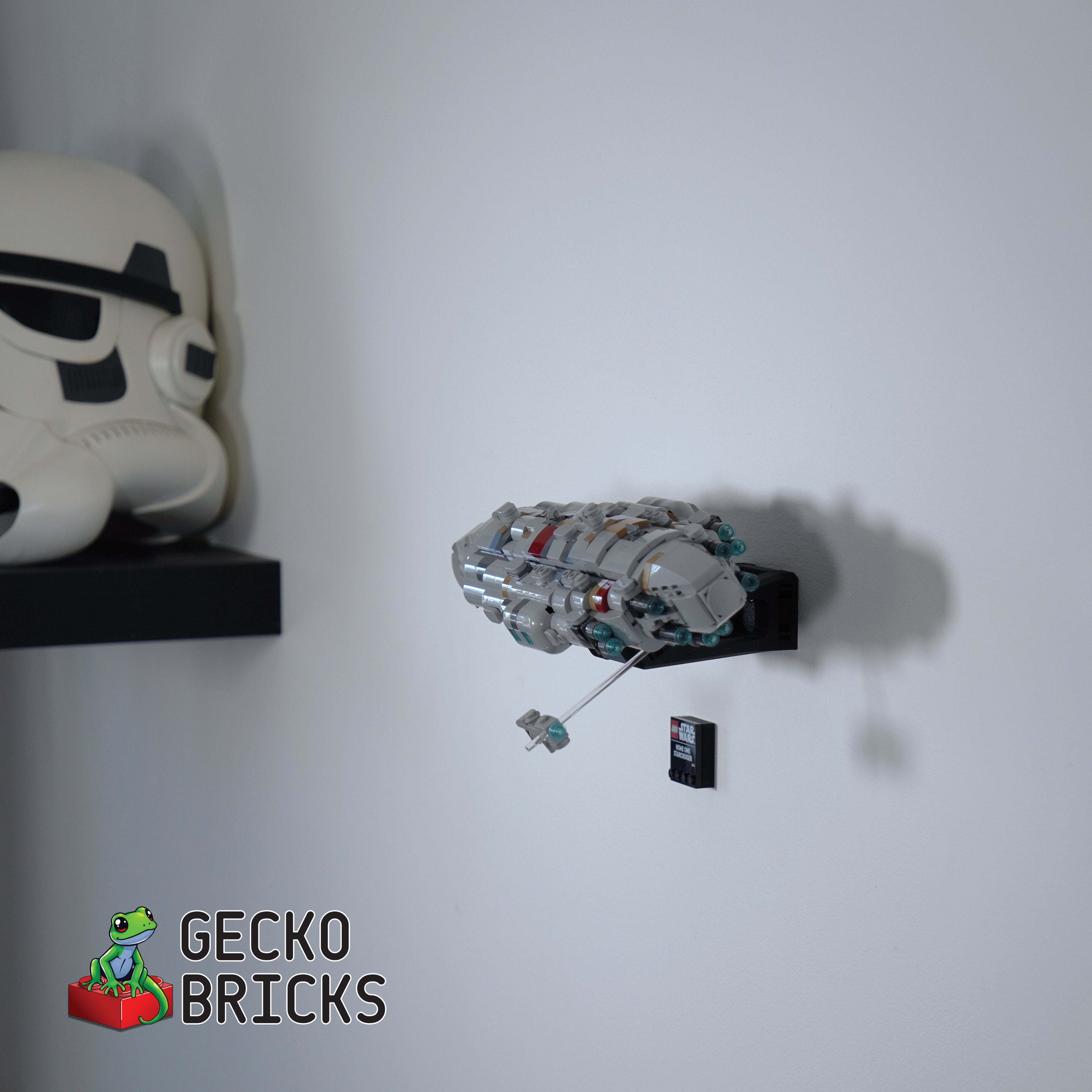 Ce support mural vous permet d'exposer votre LEGO Home One Starcruiser soit à plat contre le mur, soit incliné sur l'un des côtés. Le modèle peut être facilement retiré si nécessaire, et la solution comprend un support séparé pour la plaque signalétique pour une exposition complète à la maison.