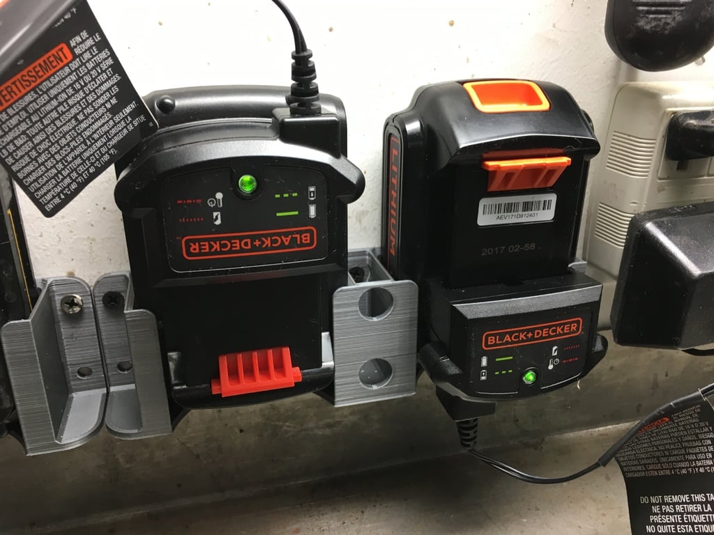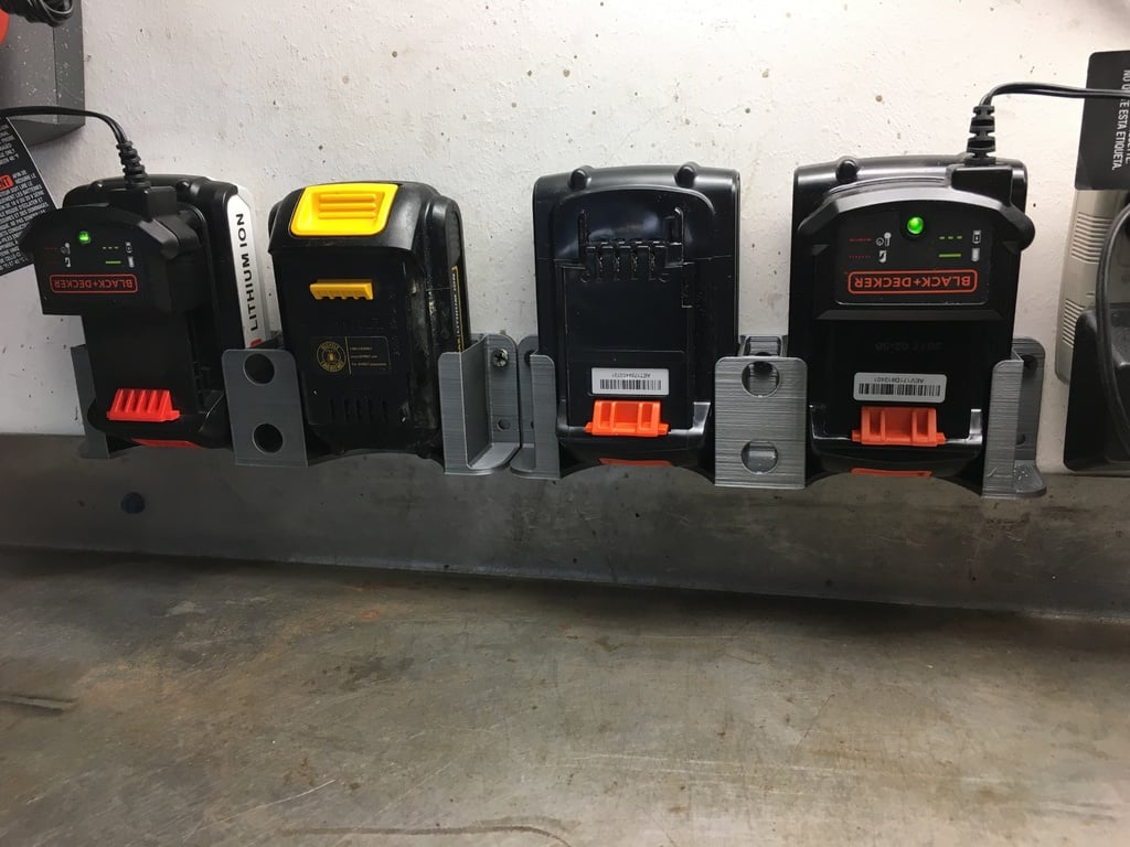 Support de batterie simple et double pour les batteries Black & Decker / DeWalt 20V. Peut être fixé au mur ou posé à la verticale. Les batteries Black & Decker 20V sont utilisées pour les machines de jardinage. Les batteries DeWalt 20V sont utilisées pour les outils électriques DeWalt standard.