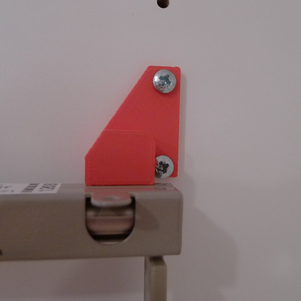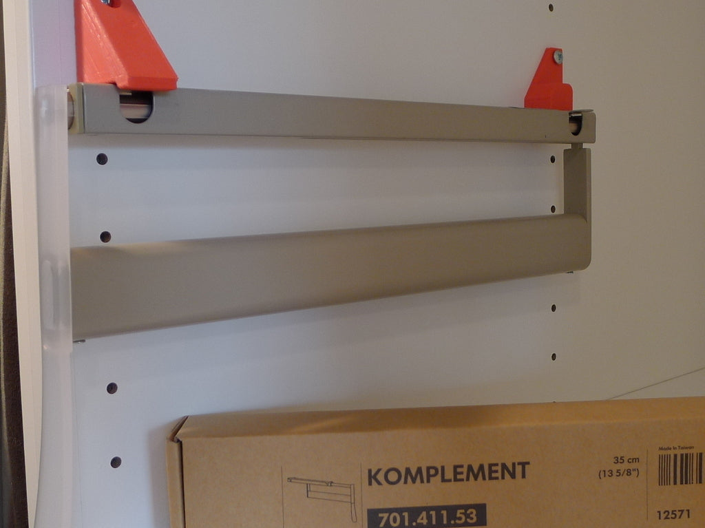 Supports pour portant à vêtements coulissant IKEA PAX KOMPLEMENT. Ces supports sont destinés à adapter le rail KOMPLEMENT aux montants de tablette de 32 mm du meuble. Ils sont utilisés pour monter les rails sur le côté de l’armoire plutôt qu’au bas d’une étagère. Cela offre un moyen plus pratique d'organiser les vêtements dans votre système PAX.