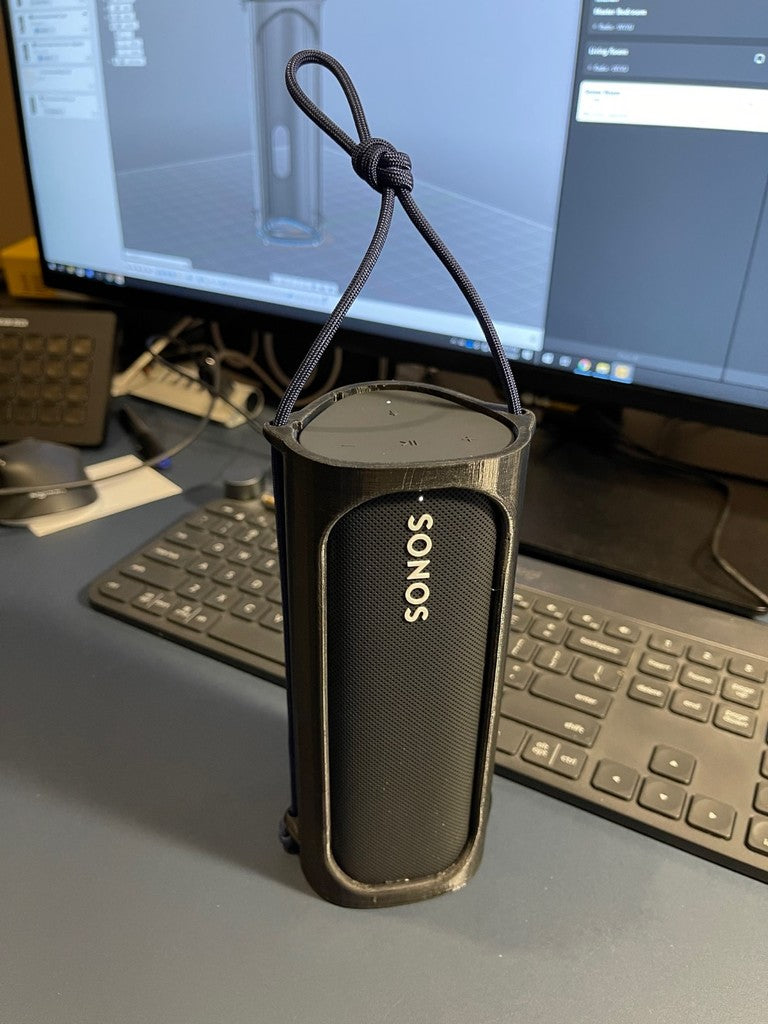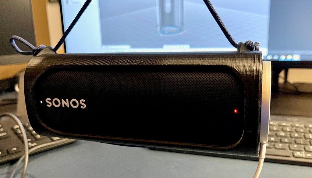 Un étui de Sonos Active avec un espace pour insérer des aimants MagSafe sous impression. Cela permet d'aligner le chargeur Apple MagSafe et de le fixer au boîtier pour charger le Sonos Roam. Le surplomb a également été repensé afin que le support ne soit plus nécessaire.