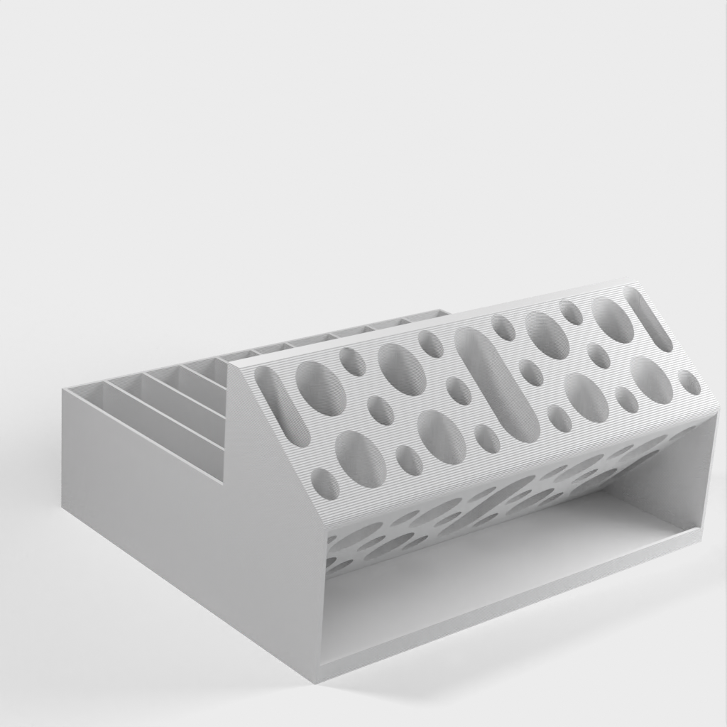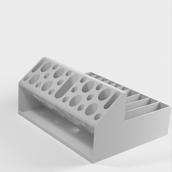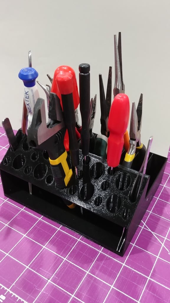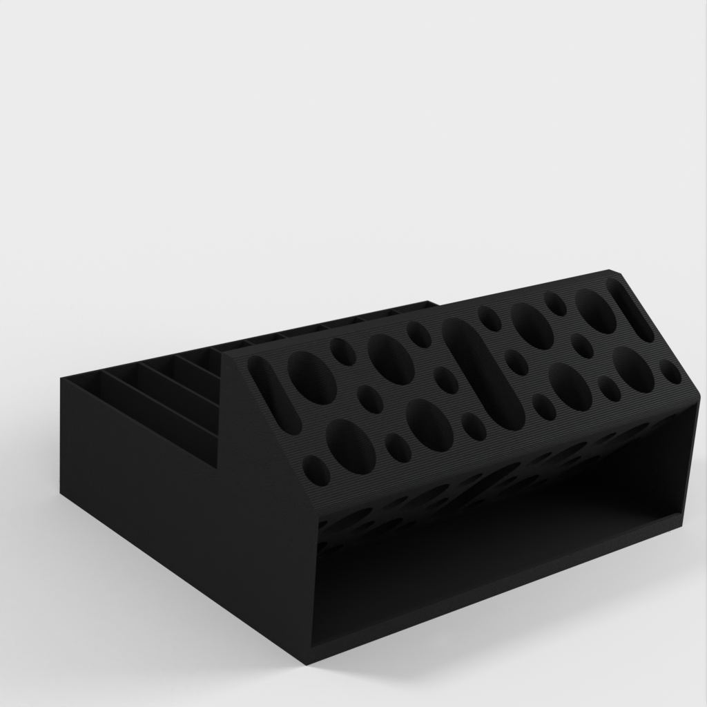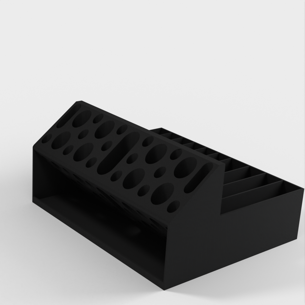 Ce porte-pince Remix est conçu pour organiser plus facilement votre collection d'outils. Il est doté de trous ovales plus grands pour accueillir une clé à molette et de fentes plus larges pour les manches de pinces plus épais. Un rebord est ajouté au bas de la section des trous ronds pour empêcher les petits objets de glisser. Parfait pour les imprimantes 3D, les amateurs, l'organisation du bureau et le rangement de l'atelier.