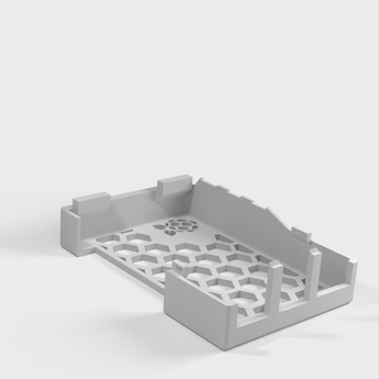 Un boîtier Raspberry Pi 5 avec des broches GPIO exposées et des trous hexagonaux pour une meilleure performance de refroidissement. Si vous disposez d'un disque de refroidissement et d'un ventilateur officiel similaire à celui illustré, il est préférable d'utiliser 'Pins-Top-Hexed-With-Logo-HeatSink-Cutoff.stl'.