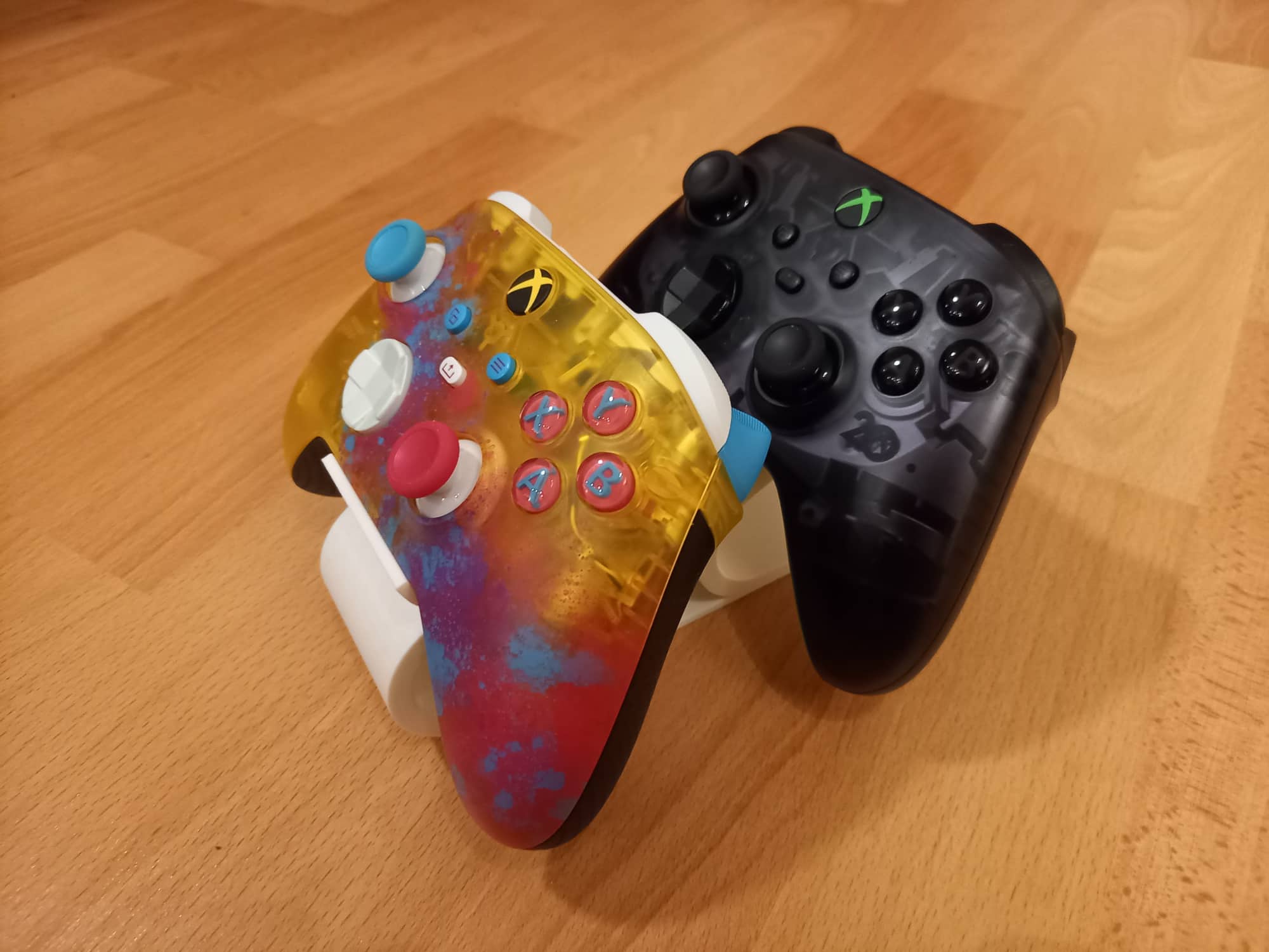 Support pour deux manettes Xbox. Ce modèle est compatible avec les manettes Xbox One et Xbox Series et est parfait pour ranger vos manettes lorsqu'elles ne sont pas utilisées. Le modèle original pour une manette est également inclus dans les fichiers.