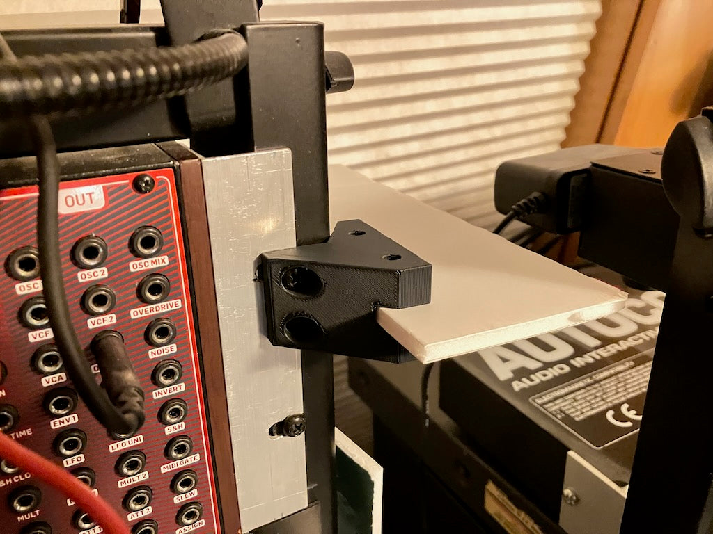 Pour fixer votre étagère en matériau plat, vous pouvez utiliser de la colle, des vis, ou simplement percer des trous dans le matériau selon le modèle sur le support et insérer des piquets d'environ 5 mm en guise de broches. La largeur du matériau de votre étagère devrait être d'environ 428 mm pour un rack de 19 pouces, mais les racks sont notoirement variables, alors mesurez après avoir installé les supports ou coupez plus long et coupez si nécessaire.