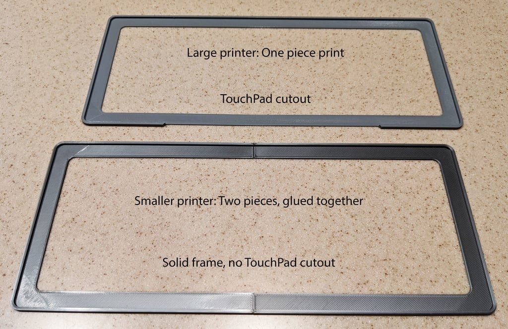 La compatibilité est assurée avec les modèles MacBook Pro plus récents, en particulier ceux avec des claviers papillon, et elle a été testée avec un MacBook Pro 15 " 2018. Vous avez la possibilité de choisir entre deux variantes de conception : un cadre complet qui entoure l'ensemble du clavier, ou une variante avec une découpe pratique à l'avant, qui garantit que votre TouchPad reste entièrement accessible.