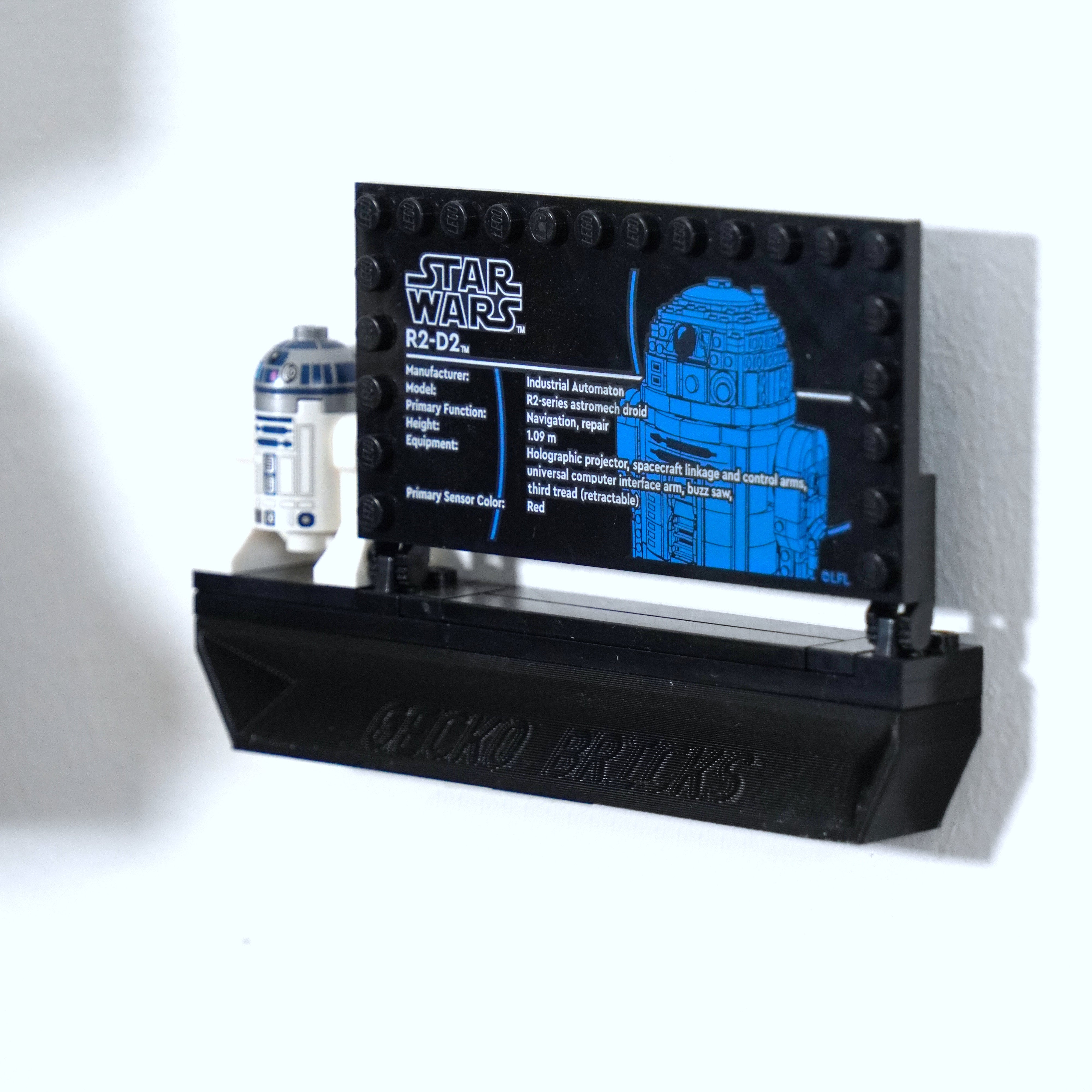 Ce support mural réglable vous permet d'exposer votre ensemble R2-D2 orienté vers l'avant, vers la gauche ou vers la droite. La solution se fixe solidement avec deux vis et comprend un support pour la carte d'information ainsi que pour la figurine, assurant une présentation complète et flexible sur le mur.