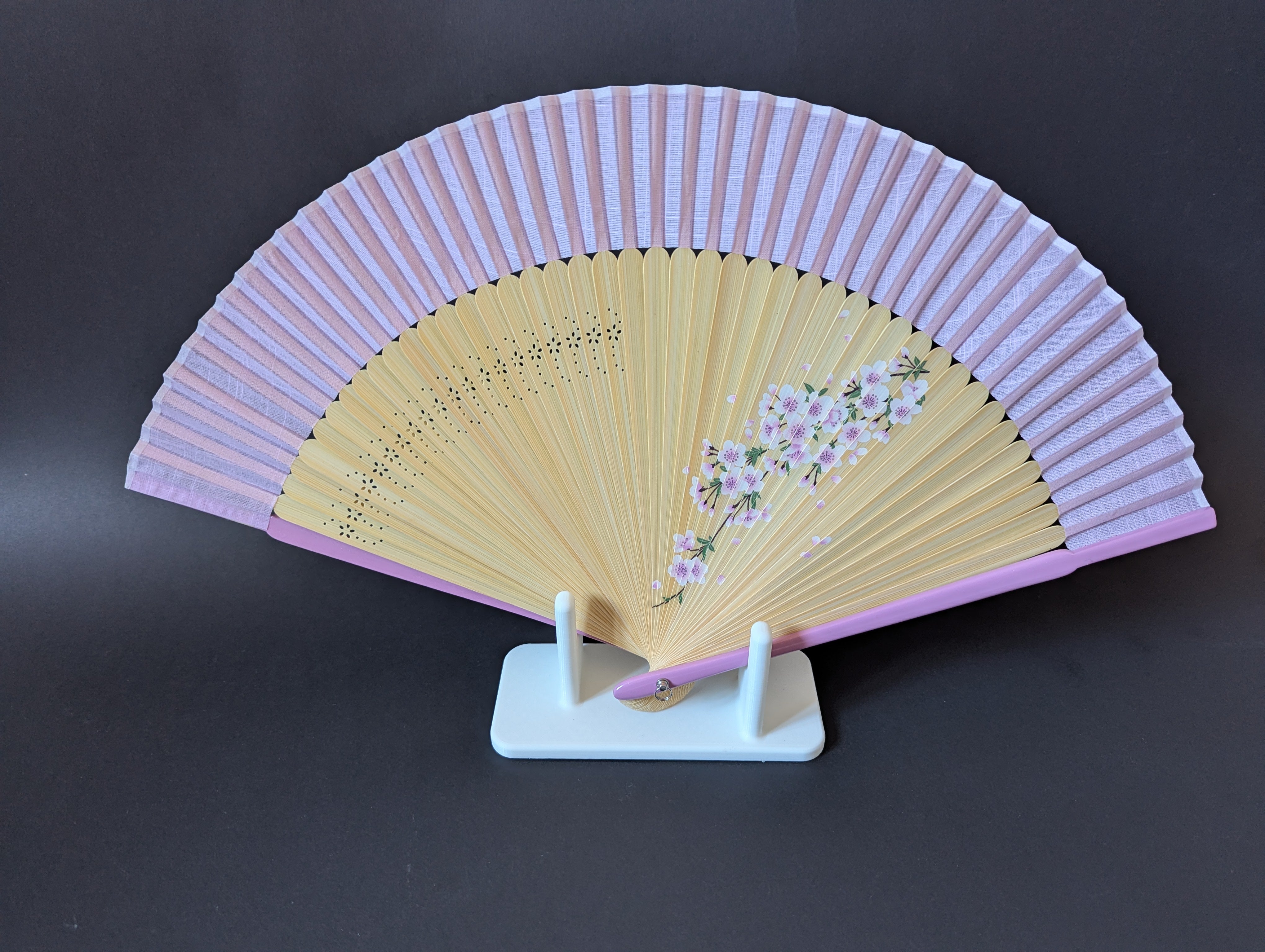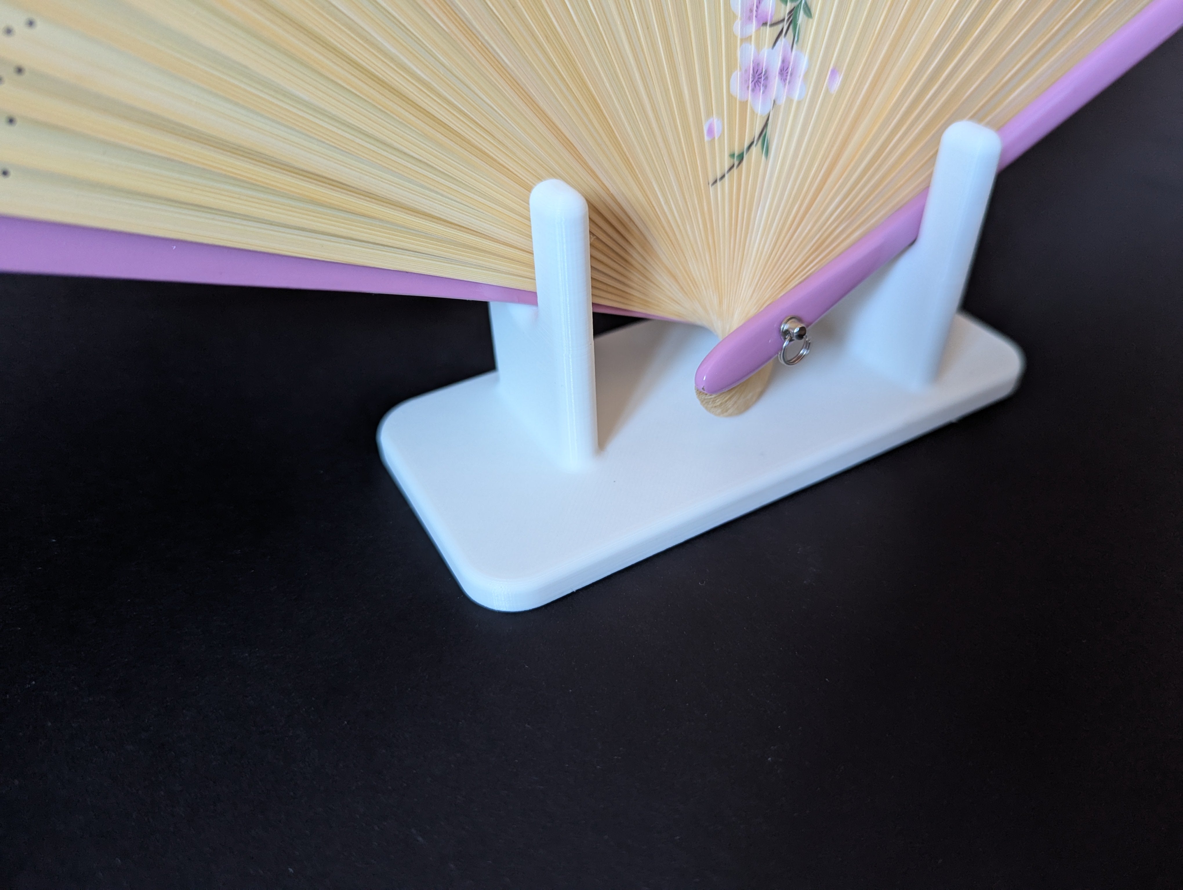 Dette minimalistiske stativ er designet til at fremvise foldbare håndvifter på en elegant måde. De forskudte ben sikrer, at viften står parallelt med stativet, hvilket passer til vifter på omkring 26 mm i bredden. Det enkle design holder fokus på selve viften frem for holderen.