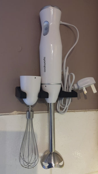 Que vous prépariez des soupes crémeuses, des smoothies frais ou de délicieuses sauces, votre mixeur plongeant est toujours facilement accessible. Bien que le support soit initialement adapté à un mixeur 'Cookworks', sa conception est flexible et pourrait potentiellement s'adapter à une large gamme de mixeurs plongeants sur le marché, ce qui en fait une solution polyvalente pour ceux qui recherchent des accessoires pratiques pour par exemple Delonghi ou des marques similaires.