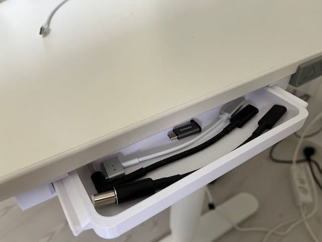 Un tiroir avec glissières pour bureau réglable en hauteur "Bekant" d'IKEA. Ce tiroir est plus bas en hauteur et la longueur est adaptée au bureau "Bekant". Parfait pour mes câbles et adaptateurs USB-C.