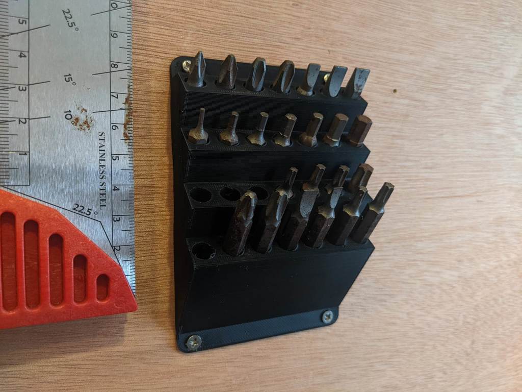 Support d'embout de tournevis de 6,35 mm (1/4 ») pour montage mural. Le produit comprend une rangée inférieure pour les embouts plus longs, tandis que les autres sont utilisés pour les embouts courts courants. Cela permet d'organiser facilement votre atelier, votre remise ou votre véhicule de travail.