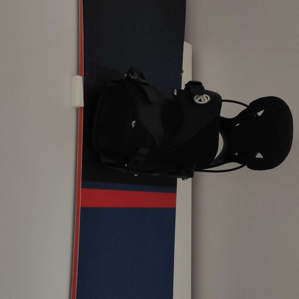 Support mural simple pour votre snowboard. Ce support est conçu pour s'adapter à tous les types de snowboards. Il vous suffit de mesurer la distance et de le monter de manière à ce que la planche se fixe et puisse être retirée en la soulevant.